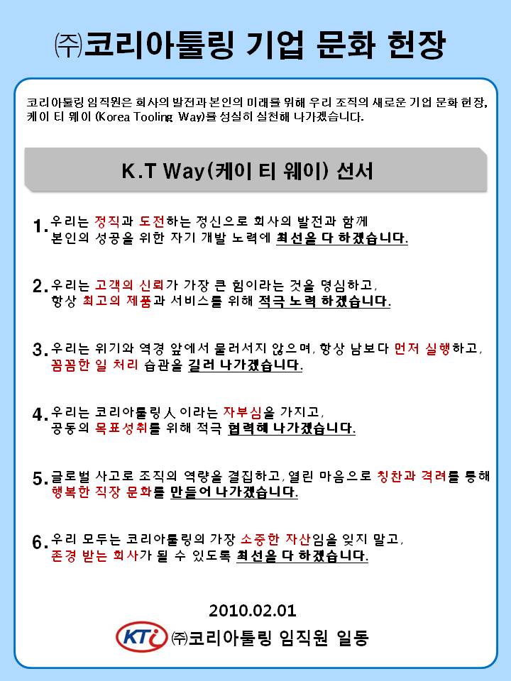 저희 코리아툴링 임직원 모두는 긍정적 사고와 강한 열정으로 "행복한 성공 파트너가 되자" 라는 소중한 비전을 가지고 고객과 함께 성장하는 기업이 되고자 노력하고 있습니다.